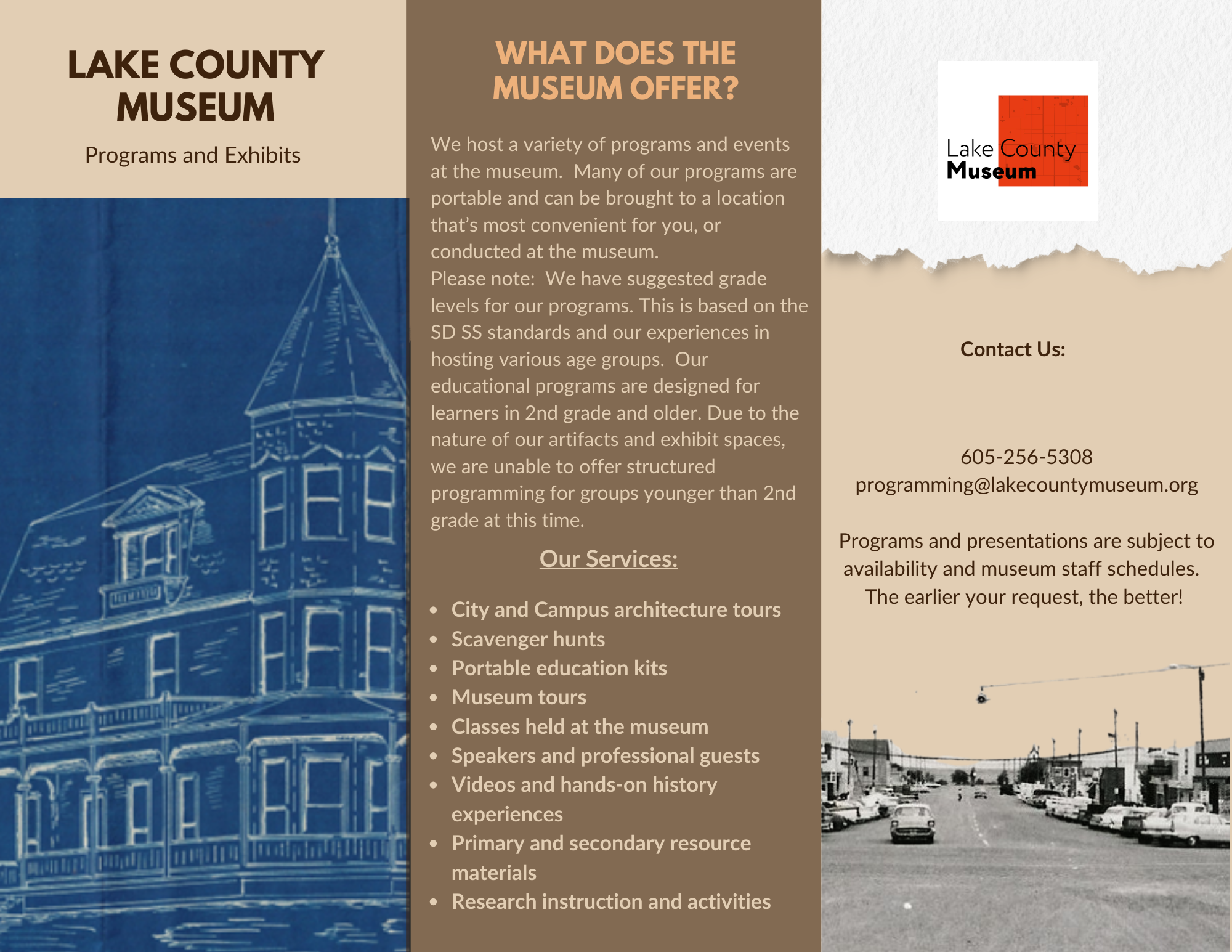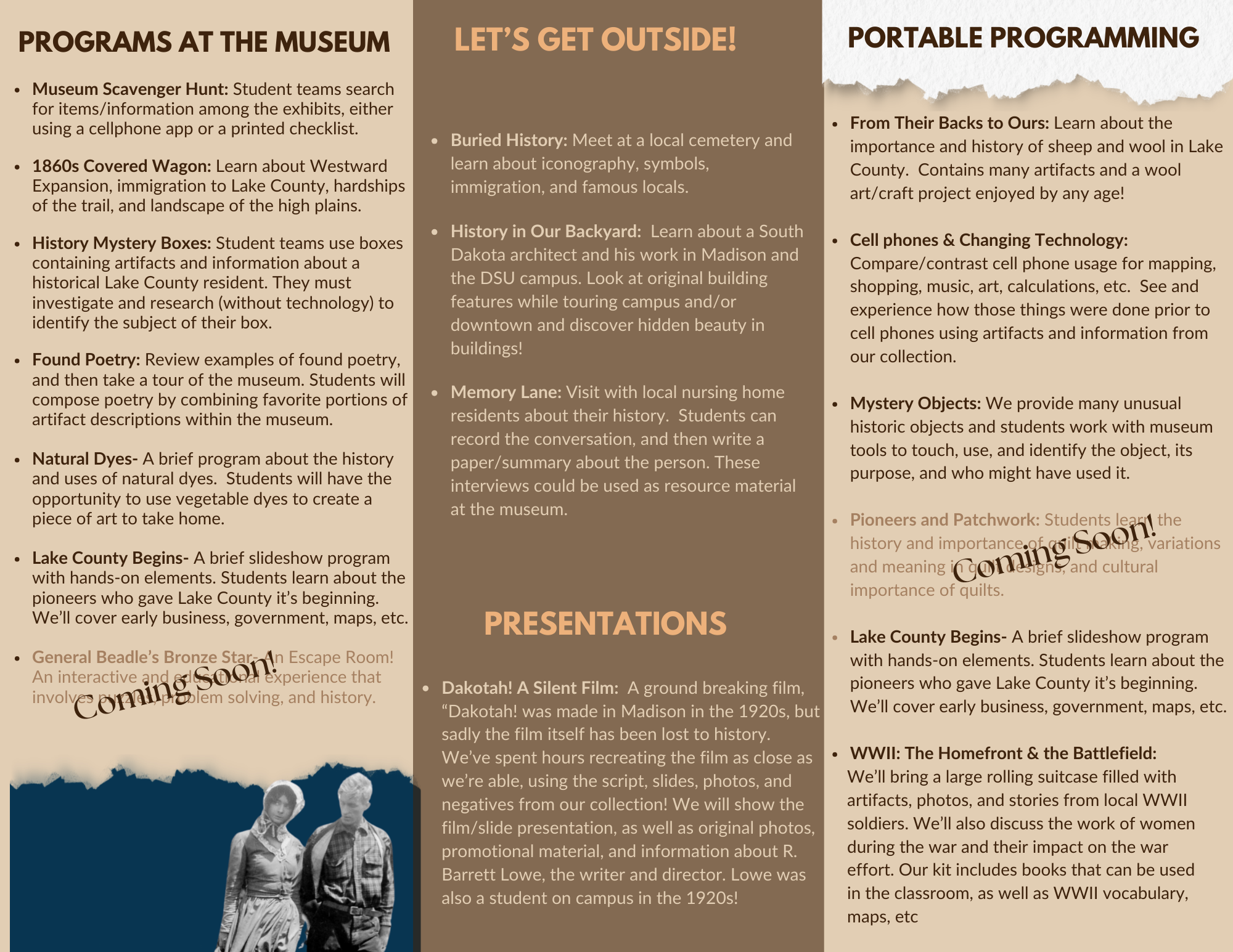 The love of history begins young and continues to grow throughout our lives. We are happy to provide programs for children and adults, whether in a school setting, at the museum, or an organizational meeting.